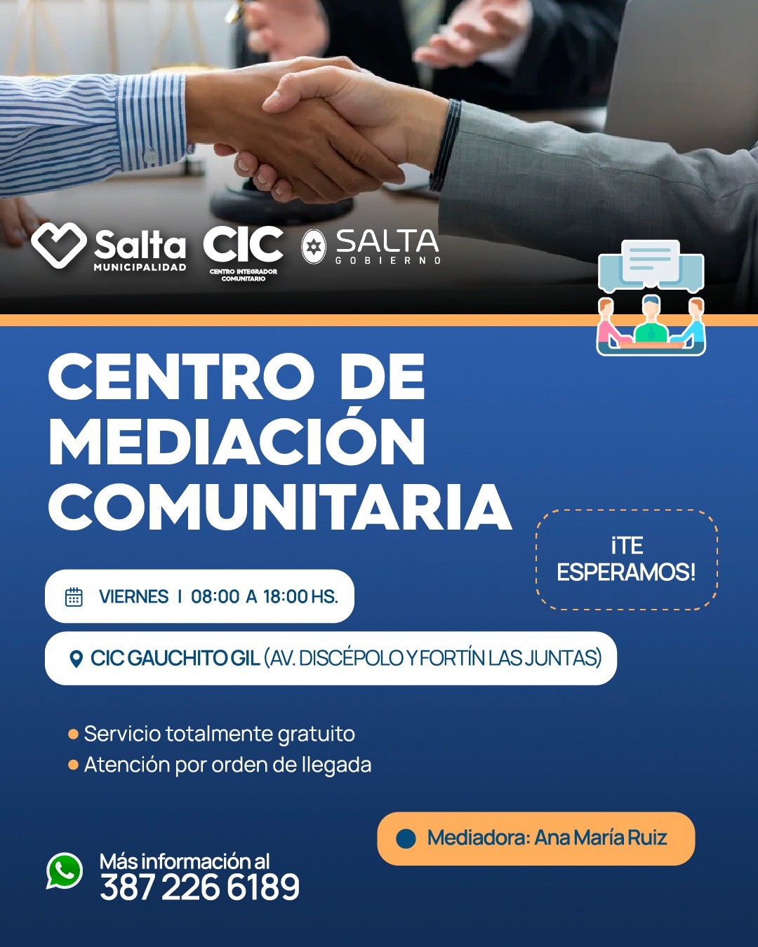 Se informa a la comunidad que se encuentra en funcionamiento el Centro de Mediación Comunitaria, un espacio destinado a la resolución pacífica de conflictos entre vecinos, familias y organizaciones.