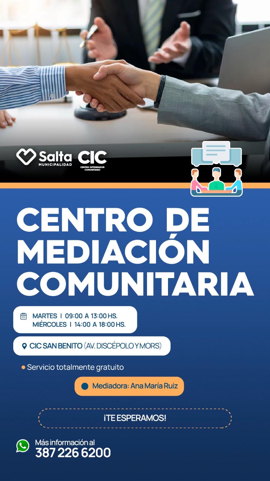 Se informa a la comunidad que se encuentra en funcionamiento el Centro de Mediación Comunitaria, un espacio destinado a la resolución pacífica de conflictos entre vecinos, familias y organizaciones. El Servicio es Gratuito.