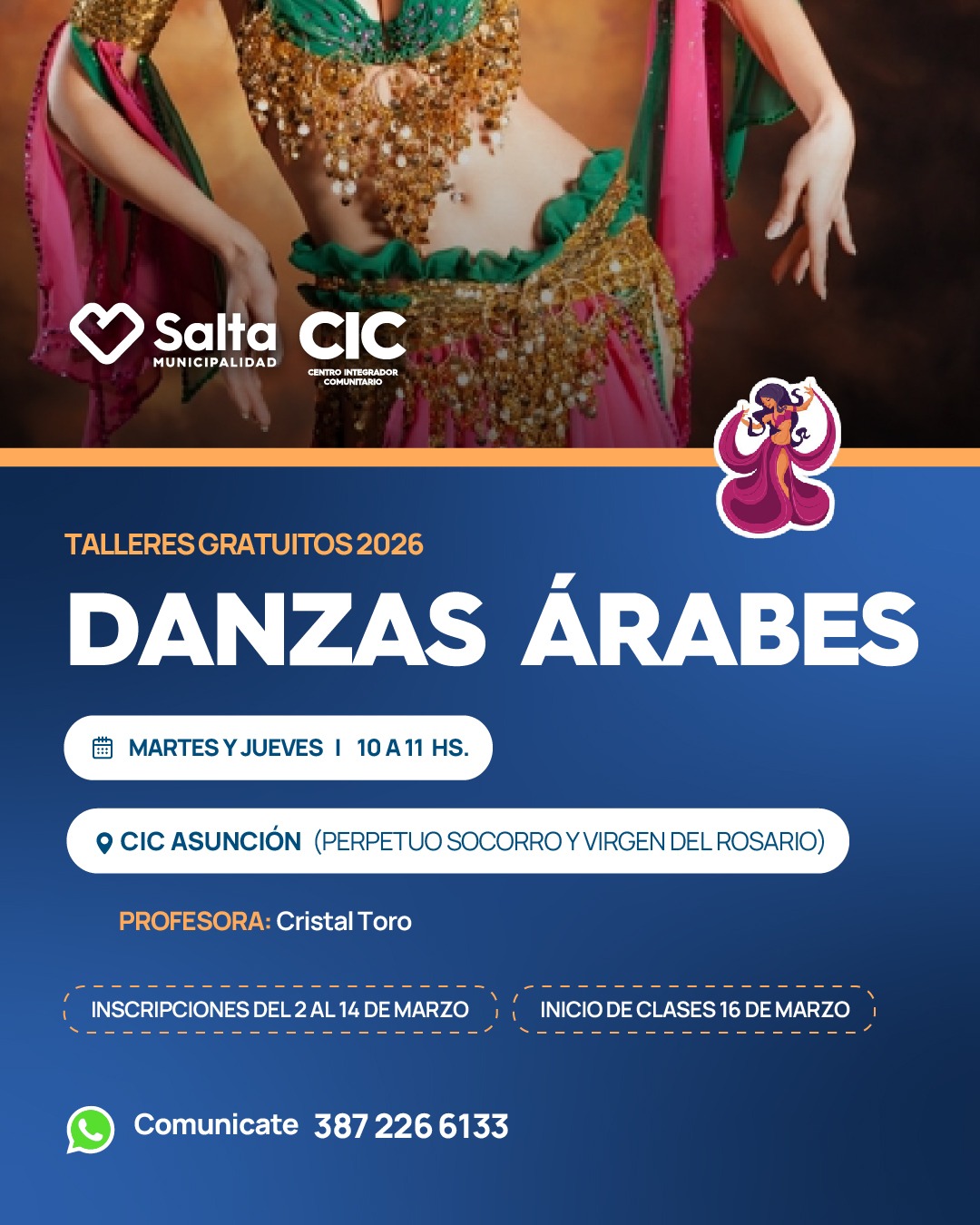 ¿Querés aprender una danza milenaria llena de energía, elegancia y muchísima diversión? ¡Entonces los talleres gratuitos de Danzas Árabes en el CIC de Asunción son el lugar ideal para vos! No importa si ya tenés experiencia o si es tu primera vez, acá lo importante es conectar con la música y pasar un momento espectacular. Es la excusa perfecta para mover el cuerpo, liberar tensiones y conocer gente nueva con tus mismos intereses. ¡Animate a descubrir este arte fascinante!
