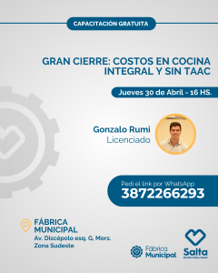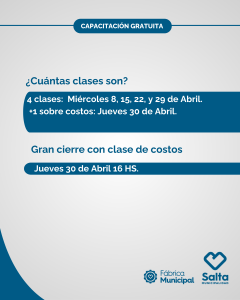 El taller tiene una duración de 4 clases de 2 horas y será dado por la capacitadora Carolina Sadir. Además de una clase de costos para emprendedores que será dada por el Licenciado Gonzalo Rumi al finalizar el curso.