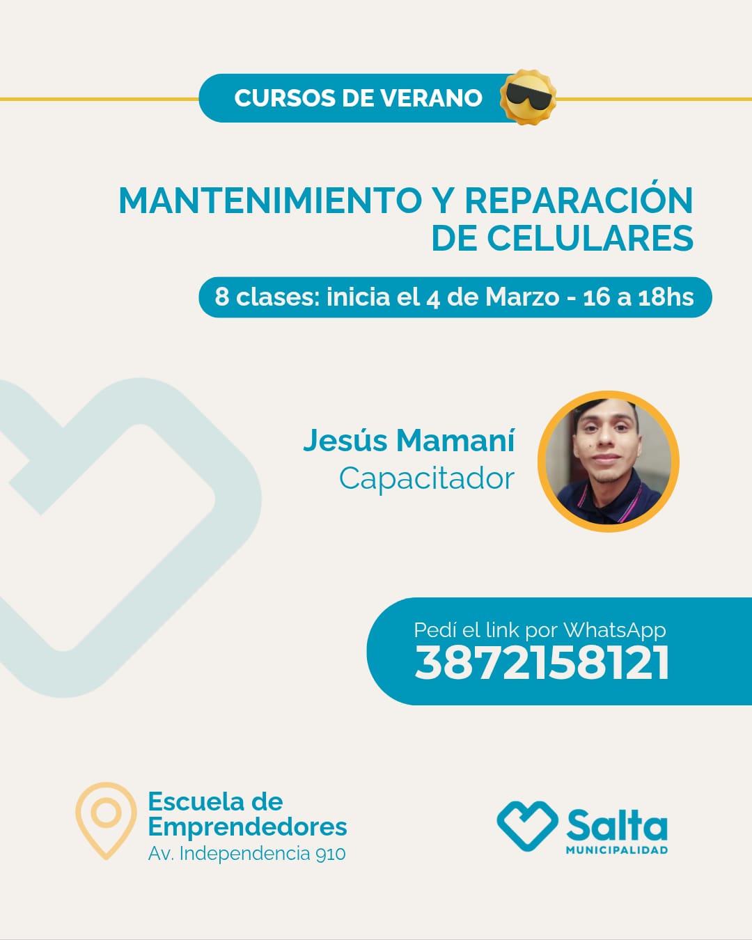 📱📞 El taller tiene una duración de 8 clases de 2 horas cada encuentro y será dado por el capacitador Jesús Mamaní📞📱