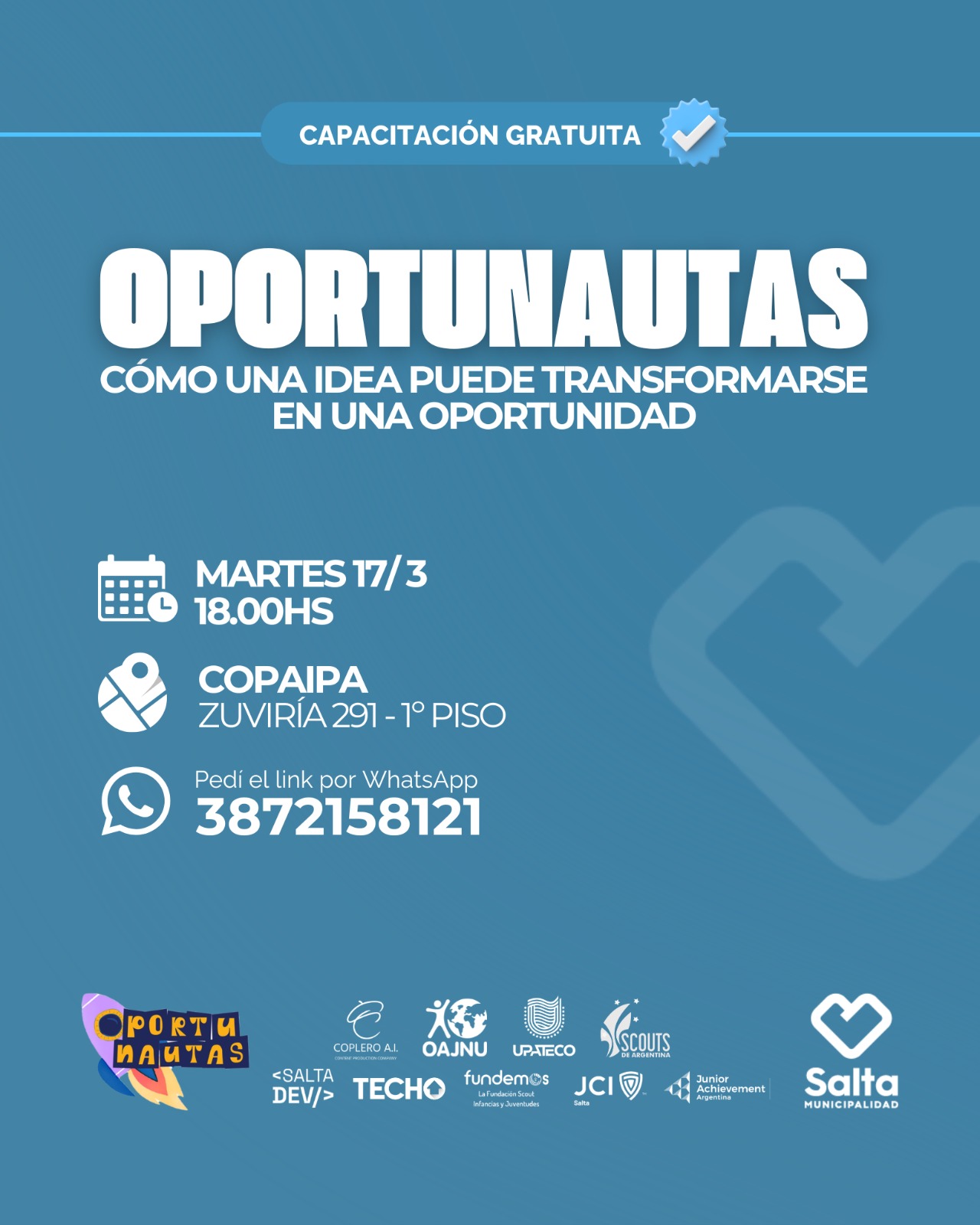 El taller se llevará a cabo el día Martes 17 de Marzo a horas 18 y está destinado a personas de HASTA 25 años. Será dictado por un gran equipo de profesionales. ¡Sumate!