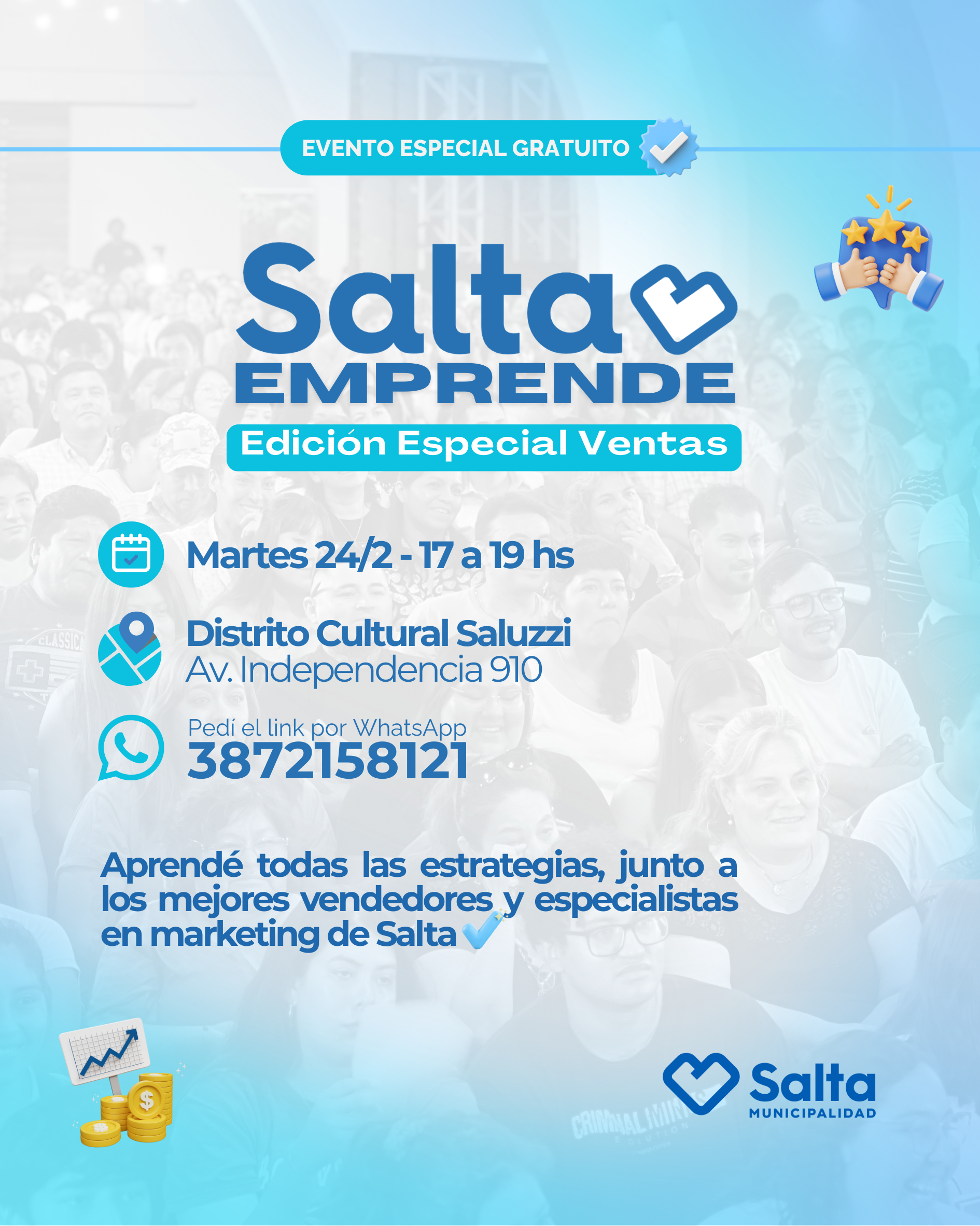 Salta Emprende – Edición Especial Ventas llega este 24 de febrero al Distrito Cultural Dino Saluzzi para vivir una jornada intensiva pensada para potenciar tus resultados. Un encuentro imperdible para emprendedores, comerciantes y profesionales que quieren vender más y mejor, incorporar herramientas prácticas y llevar su estrategia comercial al siguiente nivel. Capacitación, inspiración y networking en un solo lugar.